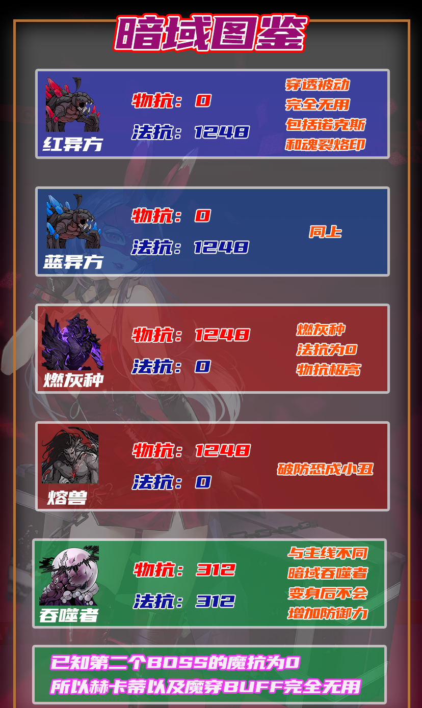 无期迷途破碎防线暗域中的boss很多,每个boss都有不一样的属性,不一样的技能,很多玩家只知其一不知其二,为了让大家可以方便通关boss,小编在这里整理了一下boss属性,分享给大家。