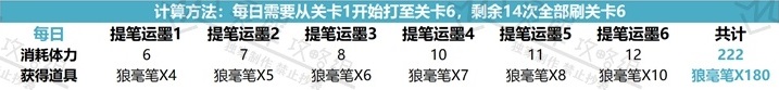 活动期间将每日解锁一个记忆章节,进入章节,通过[提笔运墨]每日灵感关卡,收集道具[狼毫笔]。该道具用于Step2抽取卷轴。每日所需体力及通过关卡可得道具如下: