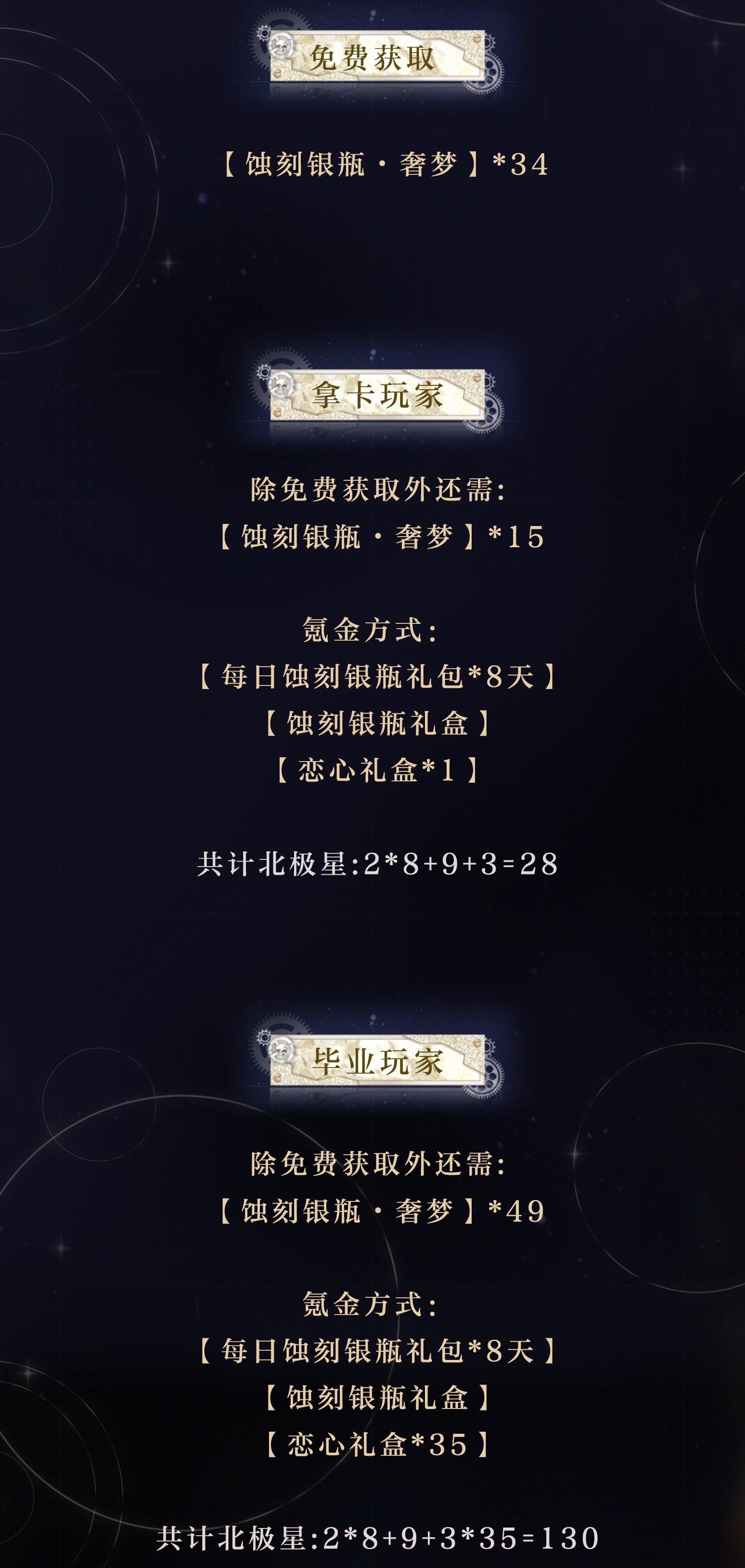 2、只想拿卡的设计师:完成限时任务,每天购买2北极星和9北极星的【蚀刻银瓶】,只需要购买1次3北极星【蚀刻银瓶】即可保底拿卡。