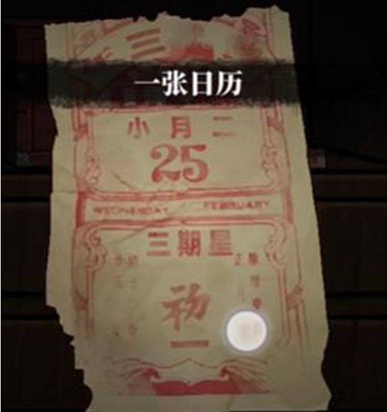 12、继续向右,查看柜子上层日历,从上到下得到密码三二三一,打开抽屉,查看账本,记住纸条上暗纹:剑↖️,扇↙️,笛↘️。