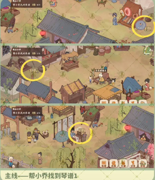 3、主线任务3:帮助小乔找到琴谱1,我们来到集市的如图所示三个地方可以找到。