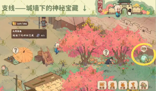 7、支线任务2:城墙下的神秘宝藏,来到城墙下方,如图所示的位置桃花树右边可以找到宝藏。