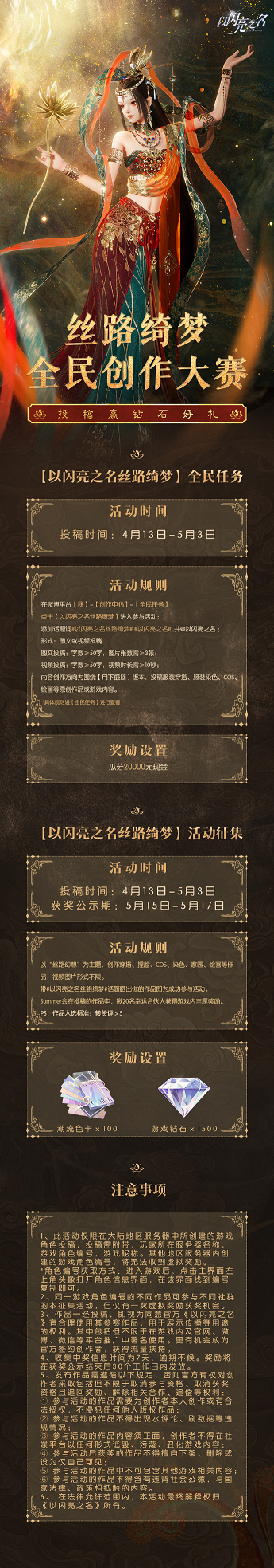 以“丝路幻想”为主题,创作穿搭、捏脸、COS、染色、家园、绘画等作品,视频图片形式不限。