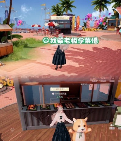 2、进入沙滩广场,在大海的方向,BBQ店铺附近,可以看到“柴老板”,样子是一只柴犬。