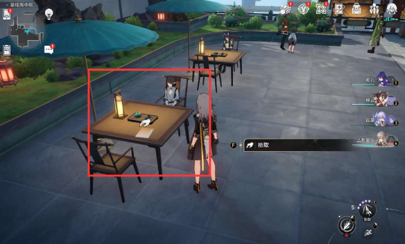 2、传送后,玩家需要往东的方向走,来到如图的位置,是一块休闲区域,在左边的座子上有一本《轻雨浥尘》书籍。