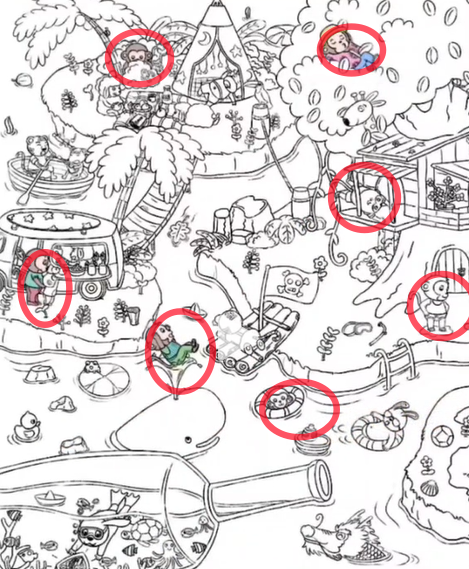 1、画面最左边的上方有躲藏猴和悠闲猴,中间的车旁边有个猴子妈,里面还有个小猴子。