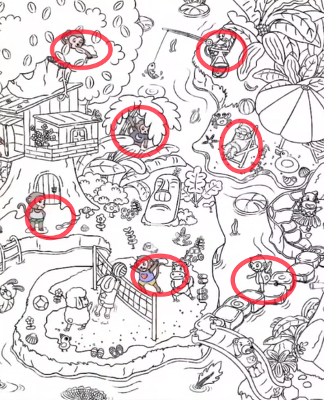 4、下方打排球的地方有个开心猴,旁边的石块上有个顽皮猴,山上有个望远猴。
