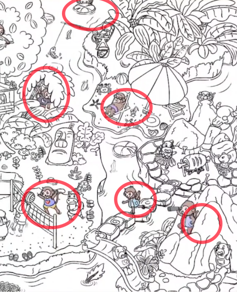 5、画面中间有个在躺椅上的墨镜猴,最上面有个荷叶猴,太阳伞旁边有个小花猴。