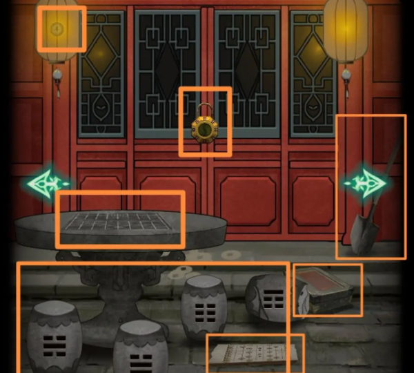 4、向右走得到铲子,观察石凳上四个八卦符号得到象棋规则,红盒子上还有三位八卦符号锁以及大门的八卦锁都需要放入正确的物品。