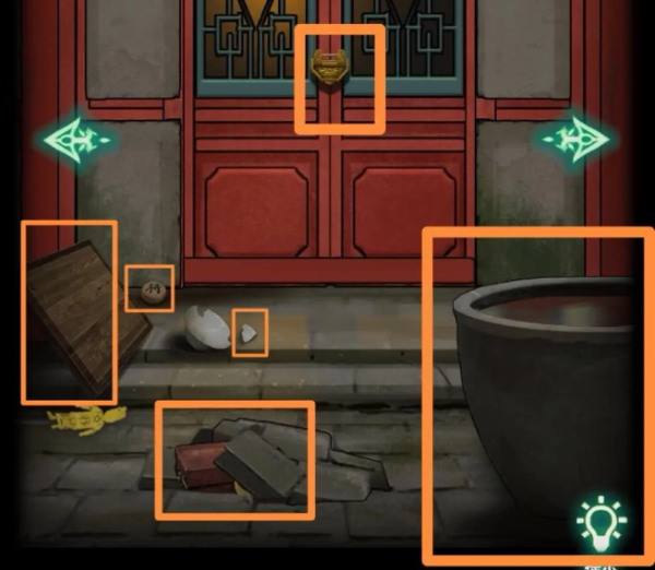 6、右转可以拾取火折子,然后井上有三个八卦符号,里面还有封在卖身契上的封语兰,台阶上有某乡报流言,西厢房门上有银锁。