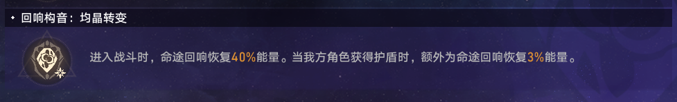3、火主的天赋可以给我方全队角色套盾,因此可以触发回响构音【均晶转变】快速恢复命途能量