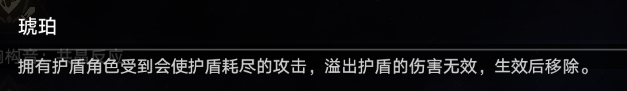 举个例子:如果你的角色护盾值只有100点,如果怪物本次攻击造成的伤害为1000点,按理来说角色受到这次攻击会扣900血,如果这时有【琥珀】状态,那相当于不会扣血。