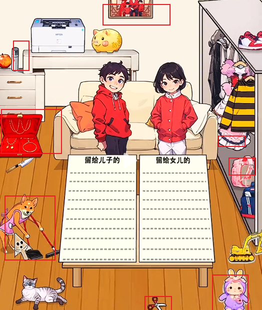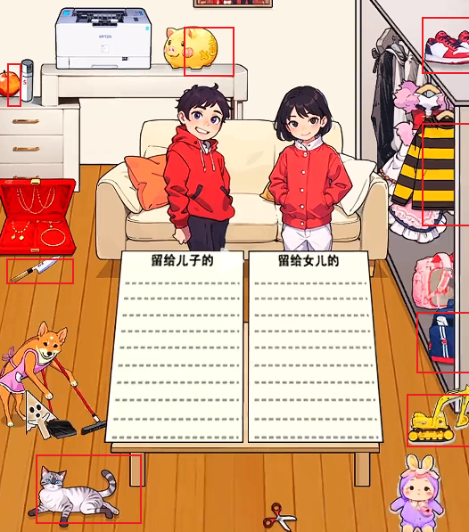 2、位置:把衣柜里的衣服和书包和儿子,接着把桌子上的苹果、金猪和地上的刀、玩具和猫和柜顶的鞋给儿子。
