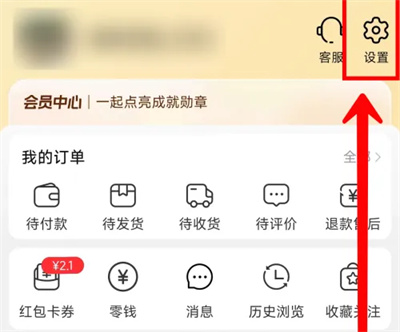 1. 打开手机淘特APP进入后,在页面的右下角点击“我的”进行切换,再在我的页面里右上角点击“设置”图标打开。