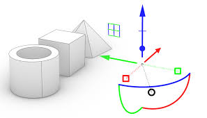 操作轴由三个轴向箭头和一个坐标原点构成。x轴箭头为红色,y轴箭头为绿色,z轴箭头为蓝色。坐标原点位于操作轴的中心位置。它主要用于控制对象的移动、旋转和缩放操作。