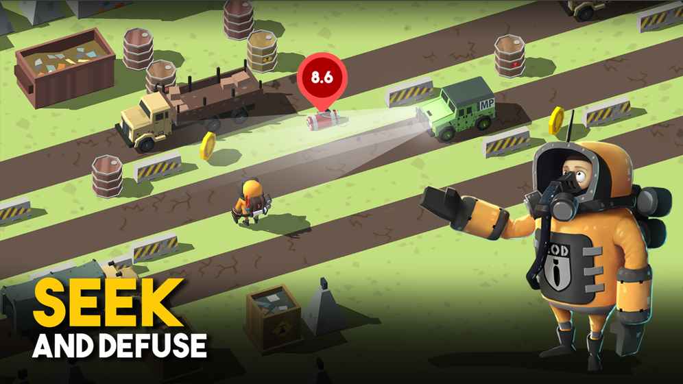 每一关的时间是固定的,一关可能需要分好几处排弹,不仅要最快时间找到炸弹所在的位置,还需要够机敏反应躲过路上的多重障碍。辅助玩法是吃金币,可以积攒换取人物得到更好的属性装备。