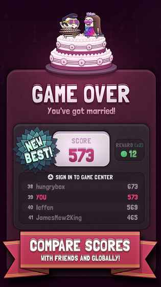 通过消除宝石和钱币,来让男女主角可以跑的更远。也许在生活中「逃婚」这样的事情很难遇见,那就在游戏中体验一把疯狂的逃婚吧~在游戏中,你可以选择一个人物完成你的逃婚计划,可以是婚礼默认的男女主角,也可以换成其他有趣的角色,坏坏的 Captain、帅气的 Cowboy,甚至还有猫王。多达 60 多种丰富可爱的人设,不过...处了男女主角外,其他角色需要内购解锁。