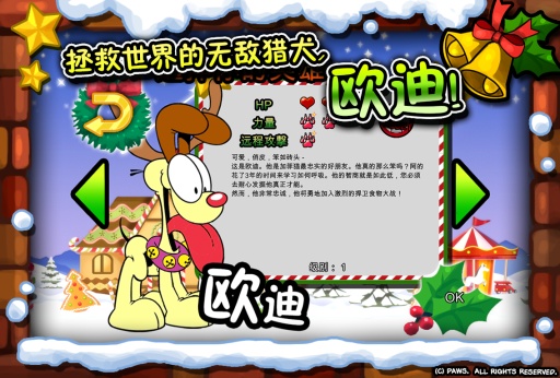 这款游戏的画面采用了2D横版的画面模式,动漫风格的人物造型经典而熟悉,玩游戏的观感绝对不会亚于看动画片哦。游戏界面的色彩运用非常丰富且高调,各种亮眼的色彩充斥着眼球,玩着游戏突然想起了小时候放学回家最开心的一件事情就是守在电视机前看动画片,那是多么单纯而又美好的时光呀。既然是圣诞特别版,自然是少不了各种红红绿绿的圣诞元素啦,圣诞树、圣诞花环、大铃铛还有穿着圣诞老人服装的加菲猫本人都将让玩家们感受到浓浓的节日气氛哦。