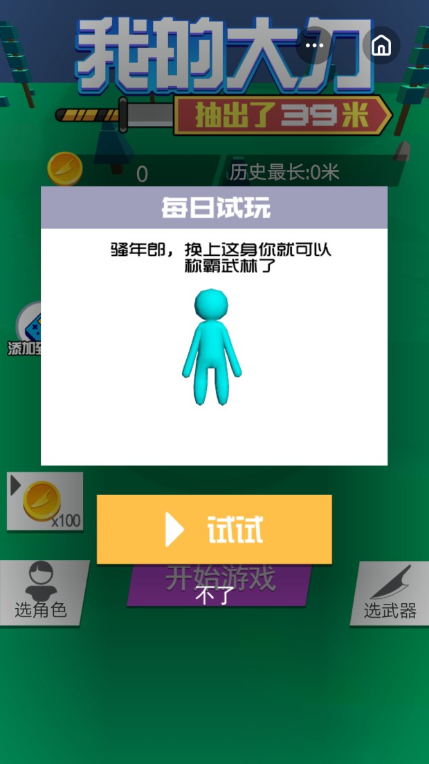 我的大刀抽出了39米是一款好玩的休闲类手游,这款游戏玩家成为一名初入武林的小白领取你的匕首,选择人物开始战斗,寻找到目标并且干掉他,喜欢这款游戏的朋友快来下载畅玩吧。