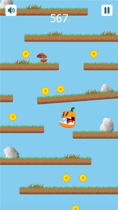 2、在游戏中操控南瓜往下跳,只能找到有空隙的地方才能跳,每个平台上都有障碍物或金币。