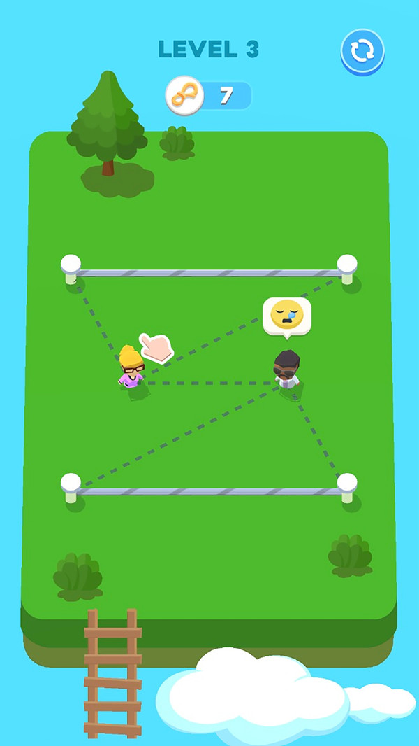 1、非常具有特色的闯关方式,每一关中都会给出一些图形的图形,这个橡皮筋只有一根,通过绑在钉子上,构成一个角,最后一步下去完成整个图形。