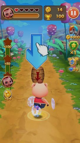 1、开始之后小猪会在道路上不停的奔跑着,前面的障碍物都有要帮助它进行躲开的。