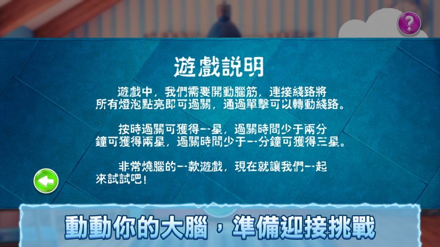 此刻通电是一款休闲有趣的闯关小游戏。游戏中有很多精心设计的关卡,每一关的玩法都不一样。玩家需要根据关卡内容,链接所有线才能过关。游戏玩法还是很有趣的,将各种乱七八糟的灯全部点亮,就能挑战下一关。