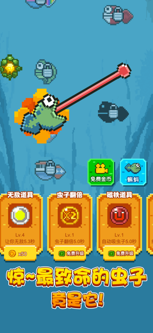 2、游戏中危机重重,不仅要和虫虫大作战,小心冲出水面的食人鱼,还要注意前方的障碍;