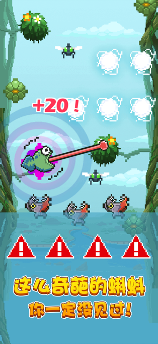 开心大逃亡是一款非常好玩的冒险像素手机游戏。玩家需要在充满危险的森林里冒险,在这里还会有昆虫、食人鱼等阻碍你的前进。不过你可以用你的舌头在树木之间移动,躲避危险收集金币,赢得游戏胜利。