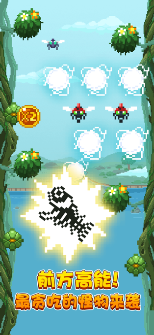 1、点击树干的植物就能跳得更远,看到昆虫和宝箱时迅速吞食,可以获得金币或道具;
