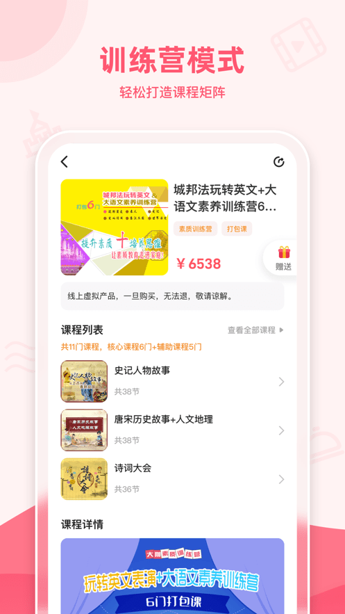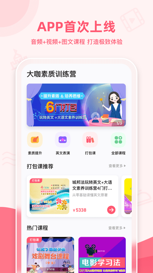 1、集合课程咨询、课程报名、观看直播、往期回放、课件下载等;