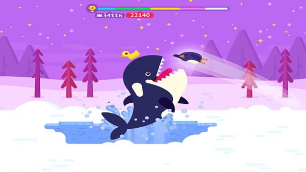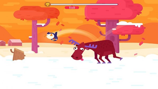 3、飞行过程通过点击屏幕控制企鹅降落在地面的各种动物或道具进行反弹飞行,