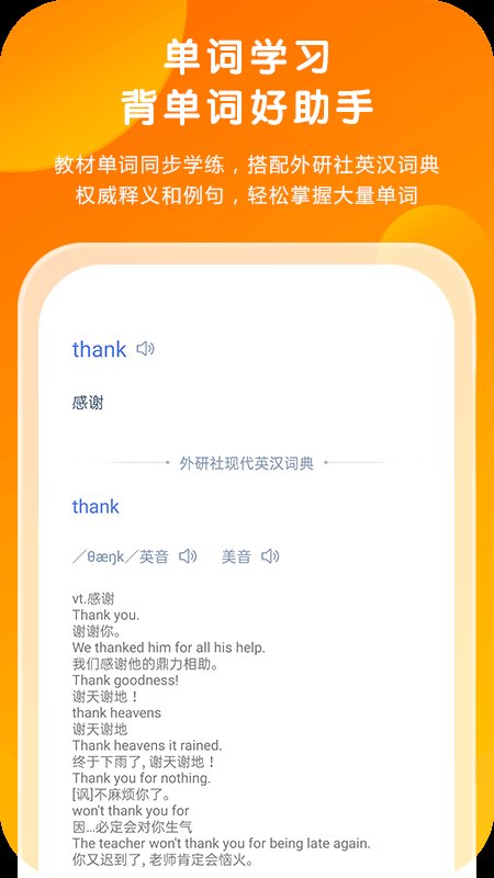 -内置外研社权威英汉词典,英美两种真人发音,且有丰富例句,音形义帮助学生记单词、学用法;同时设有选定单词听写功能