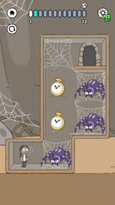 2. 环境元素交互:关卡中存在冰霜、毒气等特殊区域,玩家需引导蜘蛛进入冰冻陷阱,或利用毒气消解障碍物,如第24关需通过拉针将冰晶转移至蜘蛛巢穴,冻结追击者。