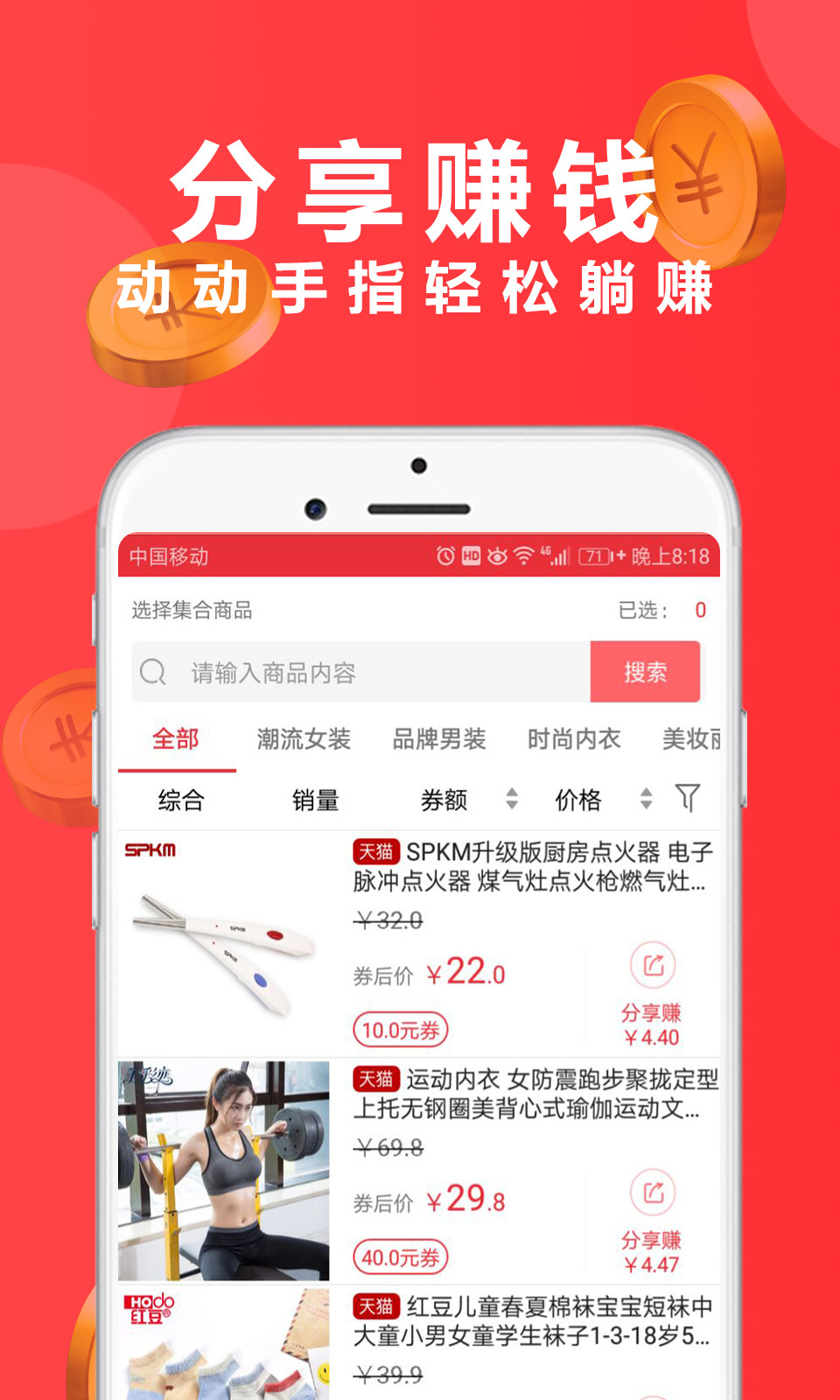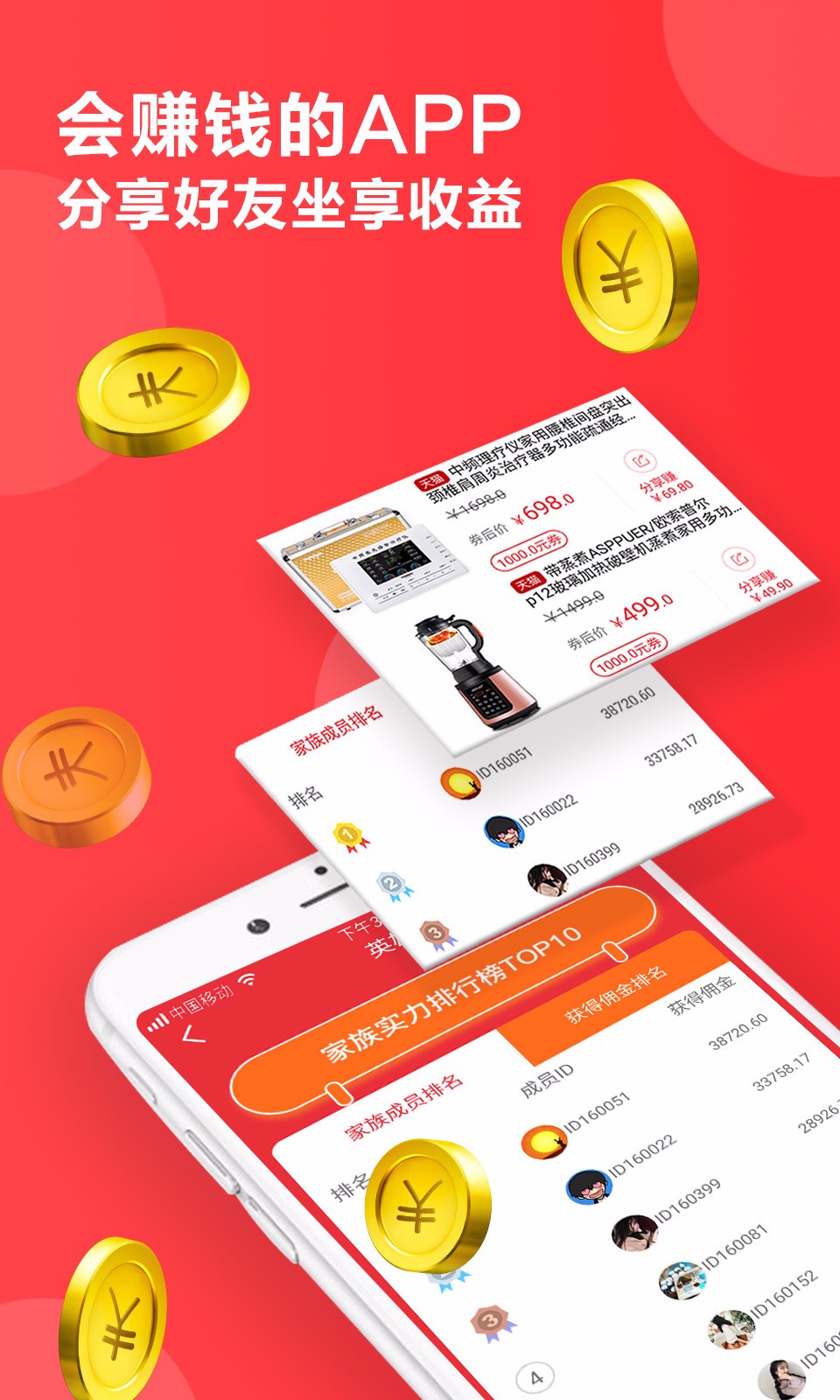 5、分享赚:一键分享微信好友、朋友圈,轻松通过社交分享躺赚佣金,让您省钱更赚钱;