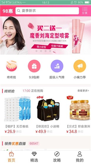 98惠app是一款帮助用户购物省钱的软件。98惠同淘宝天猫众多商家合作,精选商品,发放优惠券,用户通过98惠APP内精选的商品领取优惠券,在淘宝天猫上购物,实现省钱的目的,购物后还会有积分返现,积分可以进行游戏抽奖,获取现金,并且可以提现。