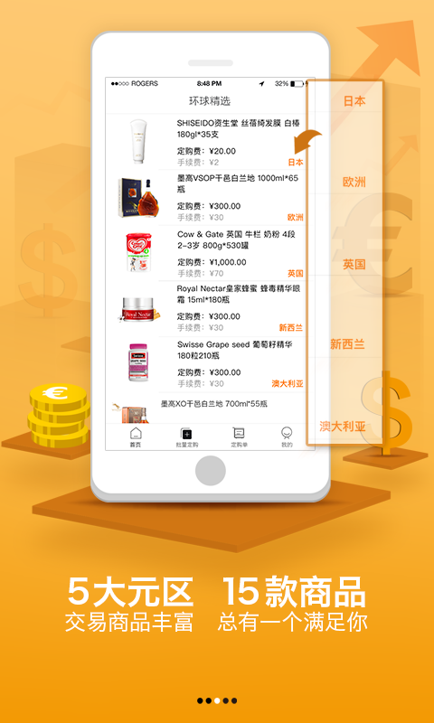 3、5大元区,15款商品,品类丰富,交易多元化;