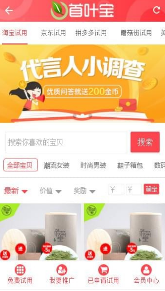 《首叶宝》是款非常受大家青睐的能申请多平台商品试用的软件应用。该软件界面简约,使用简单易上手。在这里带你发现好玩实用的商品试用信息,帮助你省钱购物,支持多家主流购物平台,你需要的都有。你还等什么?赶快下载体验吧。