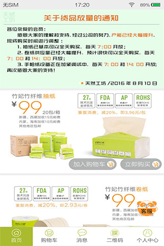 专注于纸类商品的手机购物平台!《天然工坊》不仅能为你提供种类丰富的绿色环保竹纤维纸巾产品,还可以为你提供极速物流服务,让你可以第一时间收到商品哟!赶快下载软件开始购物吧!