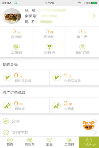5、个人中心: 账号资料编辑外的消费数据统计,社交功能以及产品相关资料的下载。