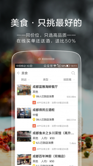1、附近美食: 帮您精挑全国各地知名美食门店;
