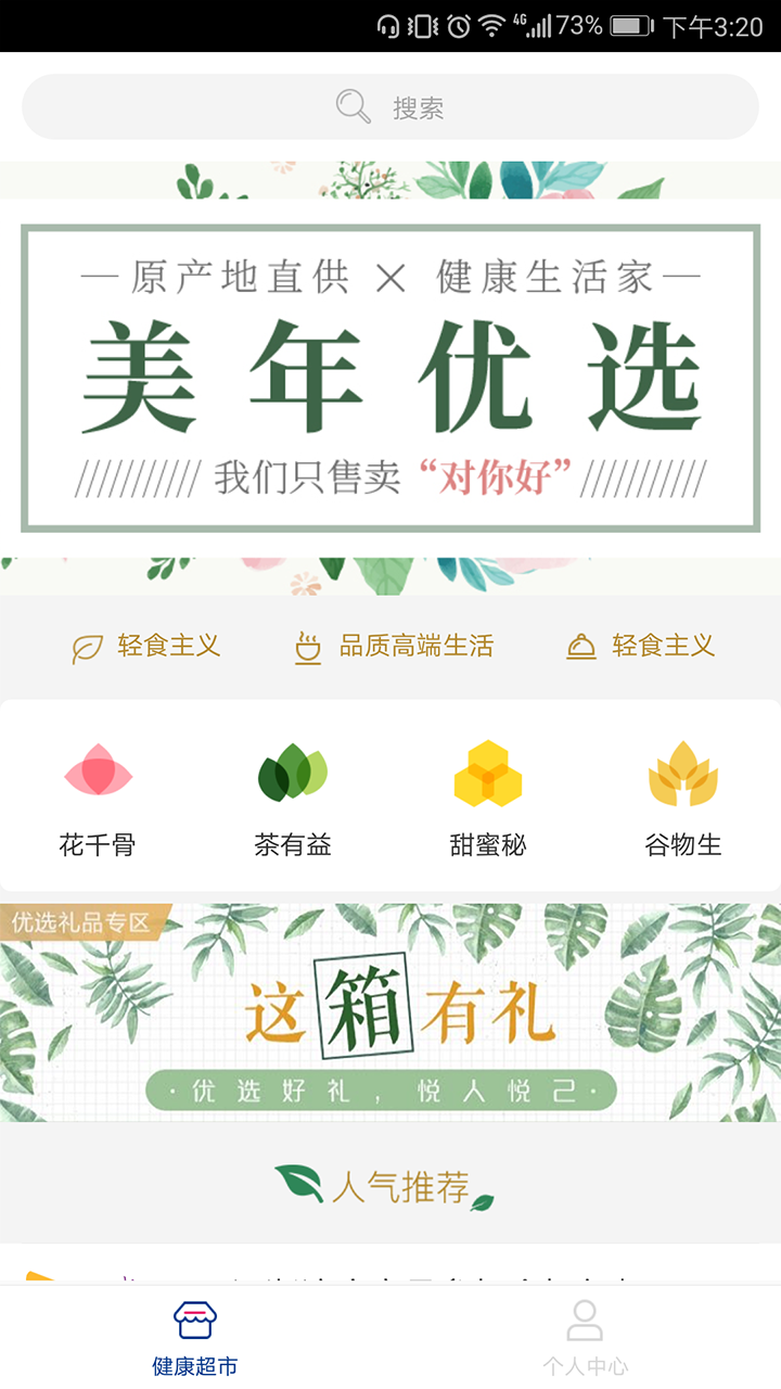 《美年优选》app是一款只售优质健康食品,原产地发货,分类详细的app。我们有花千骨,茶有益,甜蜜蜜,谷物生,这箱有礼五大分类,首页还有人气推荐,为您推荐人气产品;