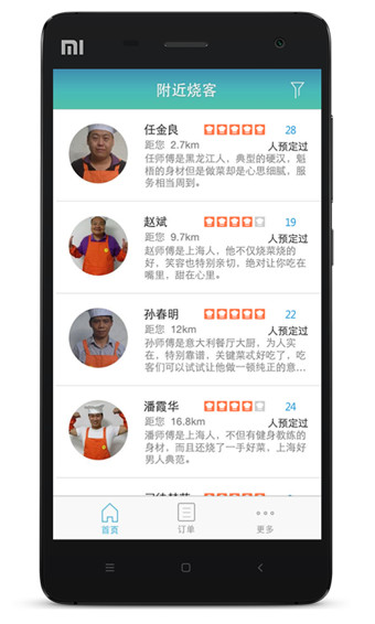 3、所有的厨师均经过严格实名验证、试菜方可进入平台,界面可看到厨师的详细信息,包括年龄、籍贯、擅长菜系、服务时间、服务范围以及顾客评价等;
