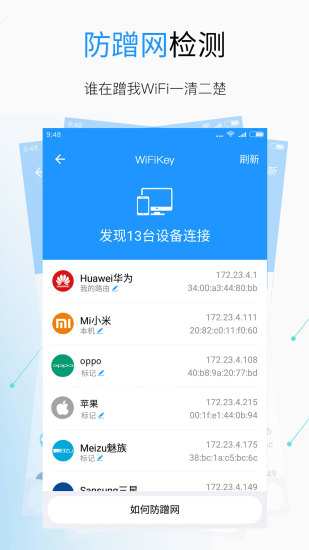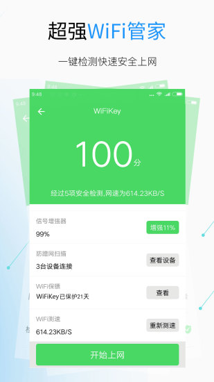 2、【WiFi管家】内置信号增强器、防蹭网扫描、wifi保镖、WiFi测速功能,一键检测WiFi信号强弱和实时连接速度,并为你的WiFi安全连接保驾护航;