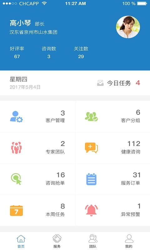 【健康云专家功能】可快速查看工作任务和信息汇总,患者异常预警、患者咨询、咨询抢单、服务订单、客户管理、客户分组、发布健康管理处方,组建或加入专家团队等功能;