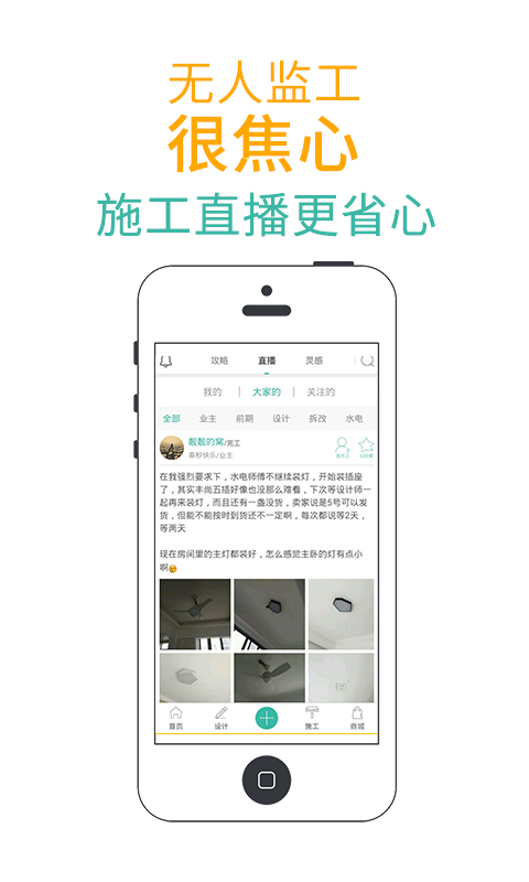 3、全程记录装修过程:设计师/工长会不断更新项目进展的照片、文字,业主足不出户就 可掌握工地细节。