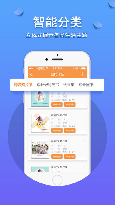 成长印记可以记录孩子每一刻的成长,在成长里也不缺少家人的爱与陪伴;同时,我们希望用最便捷的方式,把这份成长印刻成书本,让回忆历久弥新。在这里,只需简单的导入手机照片,配上文字,我们就能将这些片段还原成完整的历程,并制作成排版精美的照片书;您和孩子在翻阅的书页之间,沉浸在那份成长的美好;摩挲在光洁的纸面上,完整地传递这份感受给亲人与挚友。