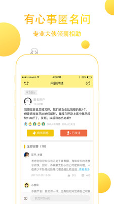 2、匿名提问,无所顾忌倾诉烦恼,比如“父母只关心我的学习成绩” “我暗恋上隔壁班的同学“父母离婚我不开心”等等……飞小凡上会有很多人第一时间回应你,帮你一起面对困难解决烦恼;
