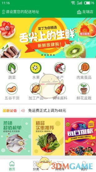 《菜丁》是一款专业的生鲜购买配送软件。通过这款软件,你可以轻松地购买到各种新鲜绿色的生鲜食品,一键下单,当天即可送货上门,让你轻松地享受到最专业的生鲜购买服务。