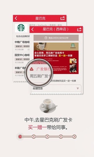 1、随时随地享优惠:汇聚全国45万家商户的优惠信息,支持34个城市;